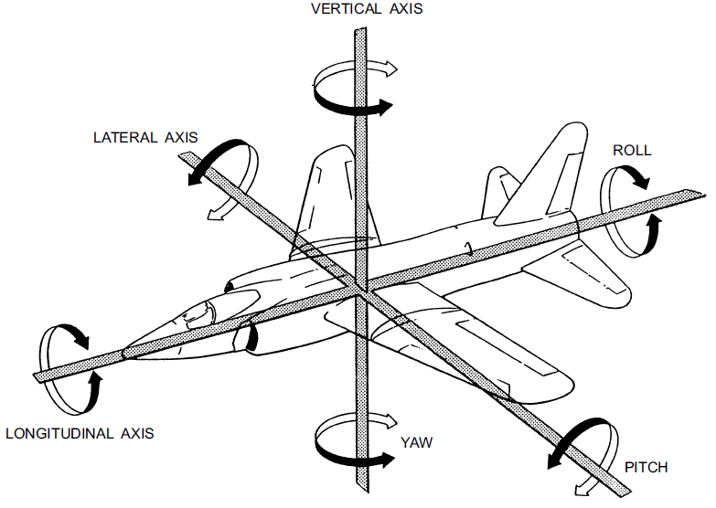 - Vertical axis (yaw) - Describe the function of the main control surfaces and the directions of deflection with respect to
